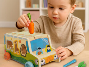 Montessori žaislai – įvairių rūšių dėlionės, instrumentai ir mokymosi įrankiai. Paprastų formų, spalvų elementai džiugina vaikus ir atskleidžia daug skirtingų žaidimo galimybių, lavinant skirtingas raidos sritis. Tokie lavinamieji žaislai ne tik skatina kūrybingumą, motorinius gebėjimus, bei smalsumą, bet taip pat lavina jausminį spektrą, lingvistinius gebėjimus.