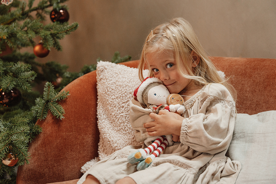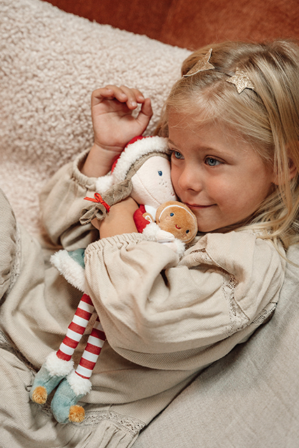 Plushie lėlė Rosa pasirengusi Kalėdoms! Su raudona kepurėle ir derančiu kostiumėliu ji mėgaujasi šviežiai iškeptu imbieriniu sausainiu. Dėl velcro užsegimo ant jos mažų rankelių ji tvirtai laiko savo užkandį. Rosa nekantrauja šias jaukias dienas švęsti kartu su tavimi.