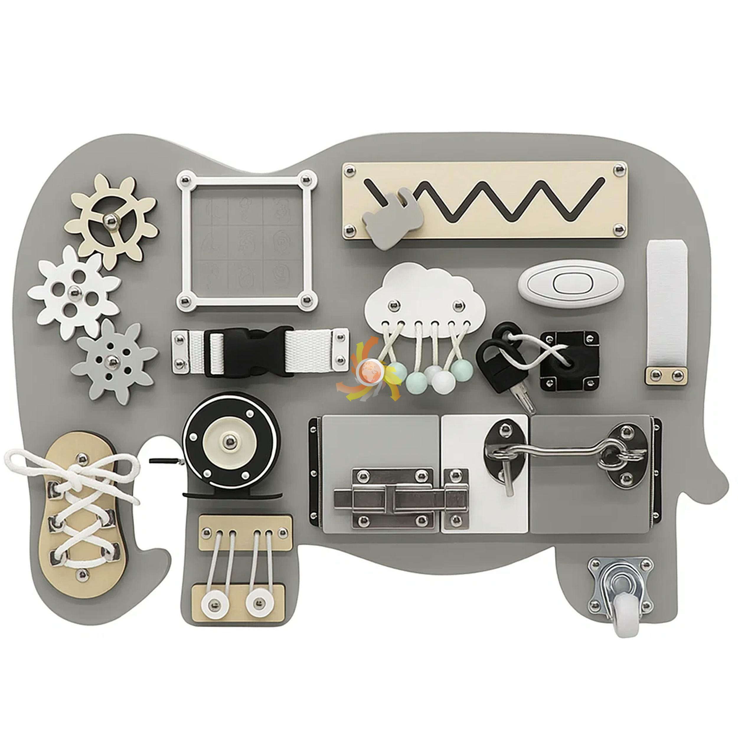 Dramblio formos sensorinė veiklos lenta yra edukacinis žaislas, kuris skatina smulkiosios motorikos įgūdžių, koncentracijos ir loginio mąstymo vystymąsi.